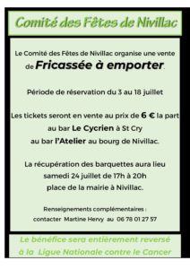 Le Comité des Fêtes de Nivillac organise une vente à emporter de Fricassée. La Fête de la Nature n’ayant pas lieu cette année, le Comité a décidé de maintenir la tradition de la fameuse Fricassée nivillacoise. La fricassée sera vendu en barquettes au prix de 6€ la portion. La vente des tickets se fera du samedi 3 juillet au 18 juillet au bar l’Atelier du bourg de Nivillac et au bar Le Cycrien à St Cry . La distribution des…