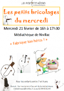 Atelier "Fabrique ton héros !" A partir d'une sélection d'albums, reproduit ou invente ton héros à la façon de Christian Voltz. Pour les enfants de 7 à 9 ans. Gratuit, sur inscriptions. Informations au 02 99 90 81 64, à mediatheque@nivillac.fr ou à l'accueil de la médiathèque.